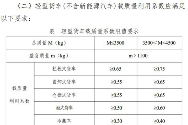 對(duì)載質(zhì)量系數(shù)的要求中包含很多專用車型,其中隨車起重運(yùn)輸車、平板貨車、車廂可卸式汽車按欄板式貨車要求執(zhí)行;對(duì)于裝有頂蓋的自卸汽車的頂蓋質(zhì)量,應(yīng)計(jì)入整備質(zhì)量,對(duì)于隨車起重運(yùn)輸車的起重裝置質(zhì)量,應(yīng)計(jì)入車輛整備質(zhì)量;廂式貨車不包含貨物運(yùn)輸車及由多用途貨車改裝的廂式貨車,倉柵式貨車包括倉柵結(jié)構(gòu)的養(yǎng)蜂車、畜禽車、桶裝垃圾車等運(yùn)輸類汽車。