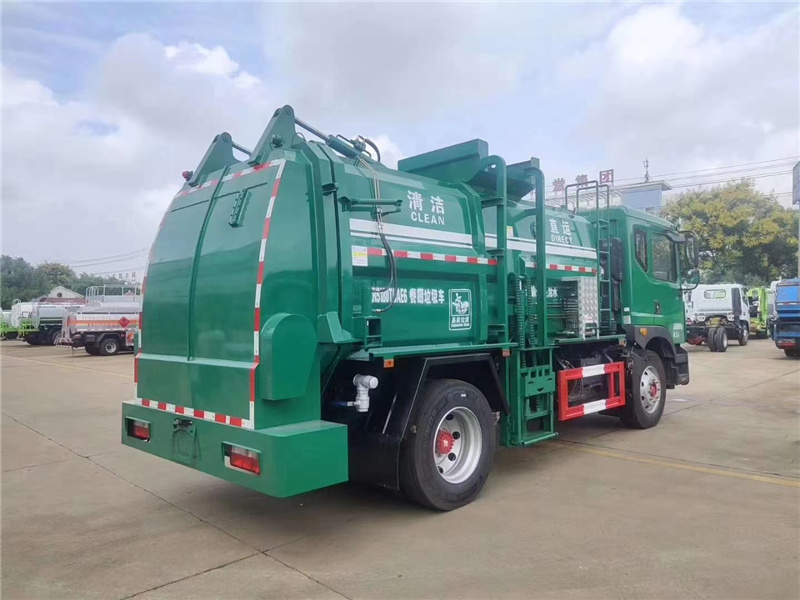 方罐式餐廚垃圾車:弧形廂體,箱體內可實現固液分離,推鏟卸料,后蓋液壓開啟/鎖緊(帶耐磨橡膠密封條密封-后門關閉后滴水不漏),后門液壓鎖緊防誤操作功能,掛桶式提升機,可配合120升、240升標準垃圾桶使用,清洗裝置(帶水箱、液壓馬達帶動高壓泵)。