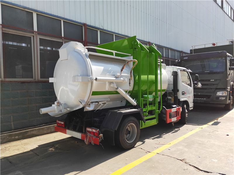 方罐式餐廚垃圾車:弧形廂體,箱體內(nèi)可實現(xiàn)固液分離,推鏟卸料,后蓋液壓**開啟/鎖緊(帶耐磨橡膠密封條密封-后門關(guān)閉后滴水不漏),后門液壓鎖緊防誤操作功能,掛桶式提升機,可配合120升、240升標(biāo)準(zhǔn)垃圾桶使用,清洗裝置(帶水箱、液壓馬達帶動高壓泵)。