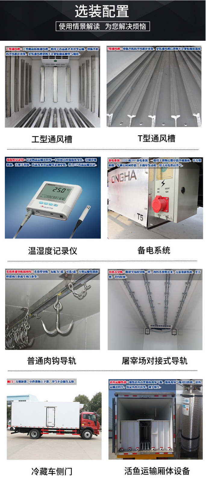 四、選裝配置:導(dǎo)軌肉鉤、T型通風槽、右側(cè)開側(cè)門、溫度實時監(jiān)控帶打印裝置、裝海鮮廂體內(nèi)部面料必須選裝不銹鋼制造、可選裝12V-24V外接電源(車輛在停止時,廂體通過外接電源進行制冷)。